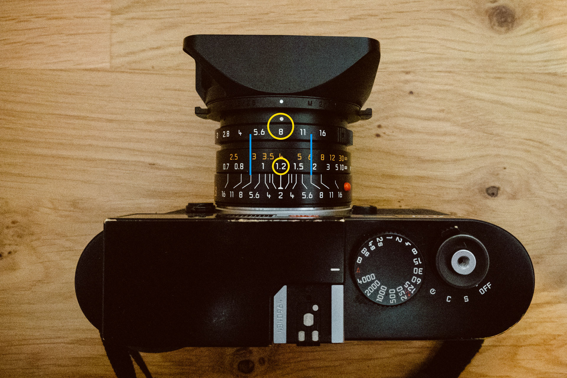 Ich stell die Entfernung meist auf ca. 1.2-1.5 Meter und die Blende auf 8 oder noch weiter zu – so ist bei 28 mm ca. alles zwischen 1m und 2m im Fokus. Das paßt (siehe obiges Foto).