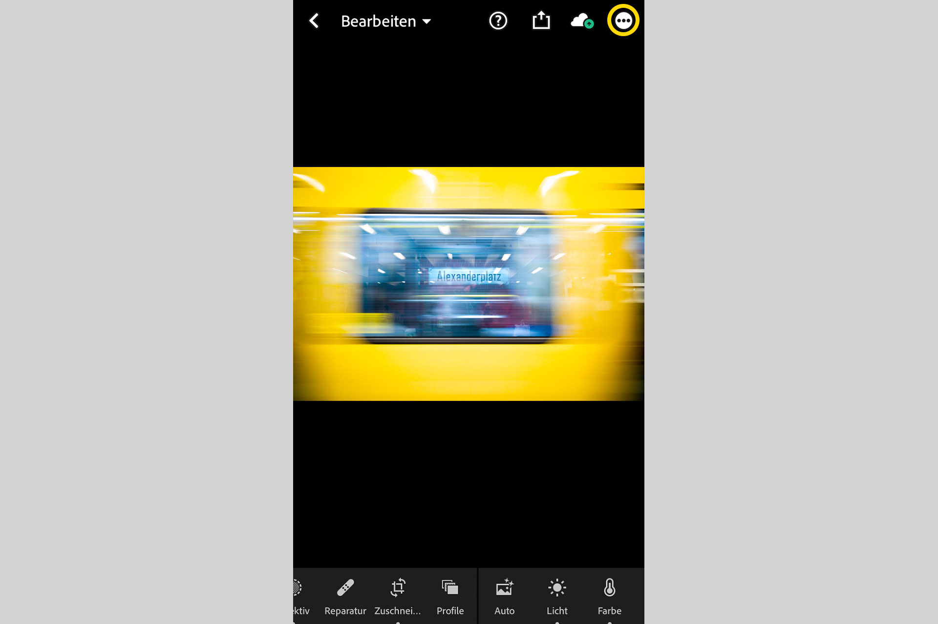 Dann öffne deinen neuen Ordner mit den DNG Bildern. Hier wählst du das erste aus und klickst danach auf die drei Punkte im Kreis oben rechts. Jetzt beschriftest du es wie du magst. Ich hab den Bildern, die du runtergeladen hast, die korrekten Bezeichnungen gegeben, wie in meiner Desktop Version z.B. „c-Berlin“ (c steht für Color).