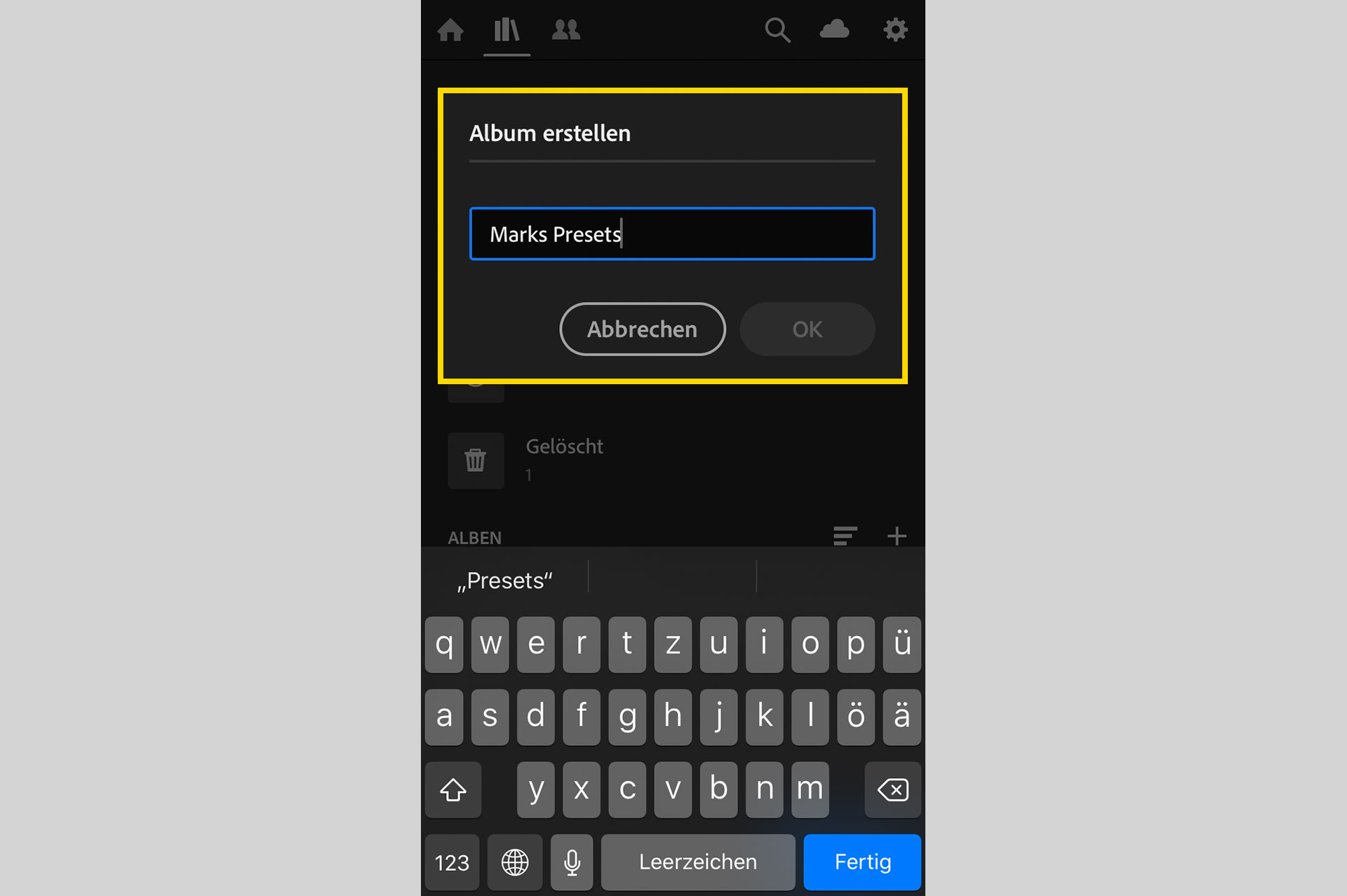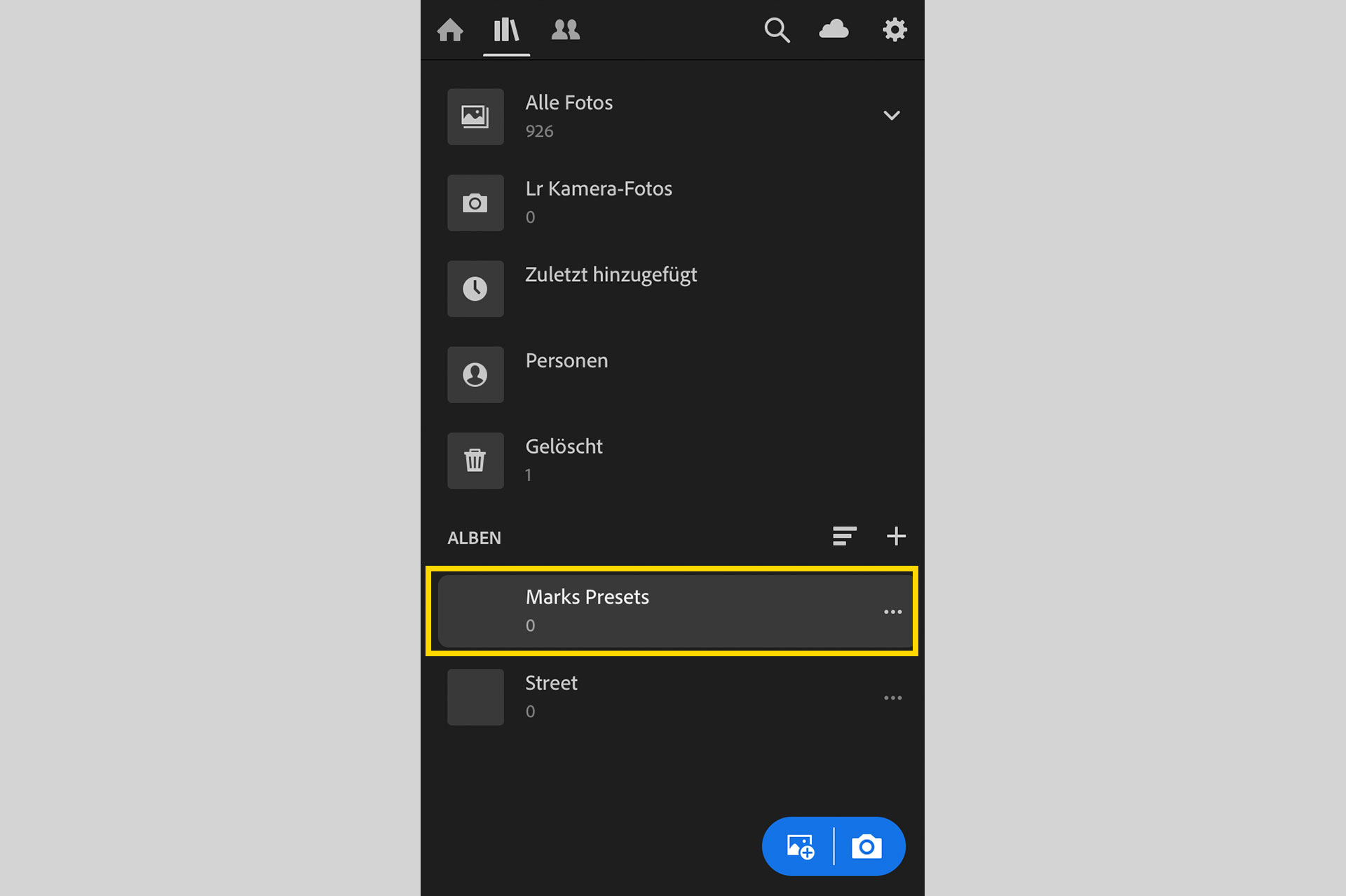 Nachdem die Bilder auf deinem Endgerät sind, öffne die LR App und erstelle ein neues Album – vielleicht Marks Presets oder sowas.