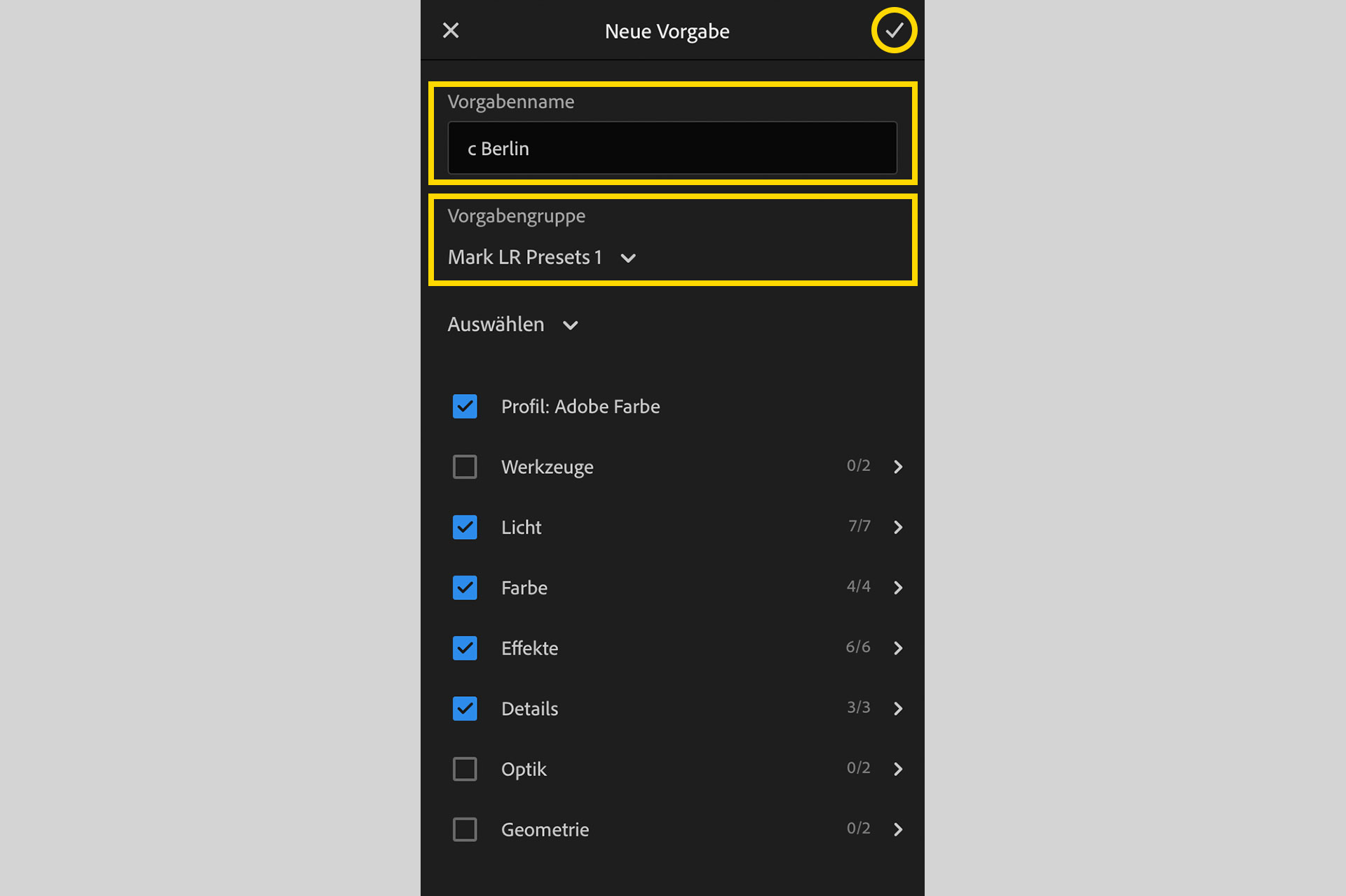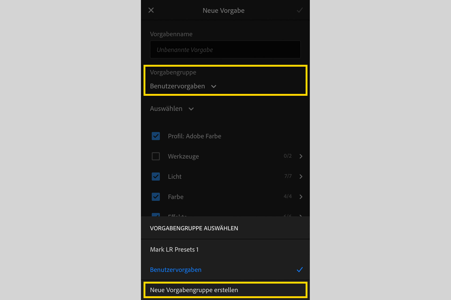 Neue Vorgabengruppe erstellen – „Mark LR Presets 1“ bietet sich an und diese dann bei der Beschriftung des Presets auch auswählen. So sind später alle schön in einem Ordner sortiert. Mit „Häkchen“ bestätigen.